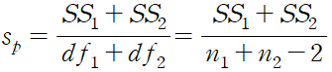 z test의 문제는 모표준편차를 알 수 없다는 점이다. 모평균은 차이검정에서는 명확하지만, 차이검정에서도 모표준편차는 도저히 알 수가 없다. 그래서 실제 연구에서는 z test 대신 t test를 많이 사용한다. t test(t검정)는 정규분포가 아닌 t분포에 기반하여 실시하는 가설검정으로, z test와 모든 면에서 같지만 모표준편차 대신 s(표본 표준편차)를 사용한다. 이때 사용하는 t분포의 자유도는 n-1이고, 차이검정의 경우 n1+n2-2다. 차이검정의 경우 두 표본의 모분산이 다르면 t test를 할 수 없다. 만약 같은 경우 표본 분산(합동 표본분산)은 다음과 같이 산출한다(이때 SS의 계산에는 n이 아닌 n-1을 사용).